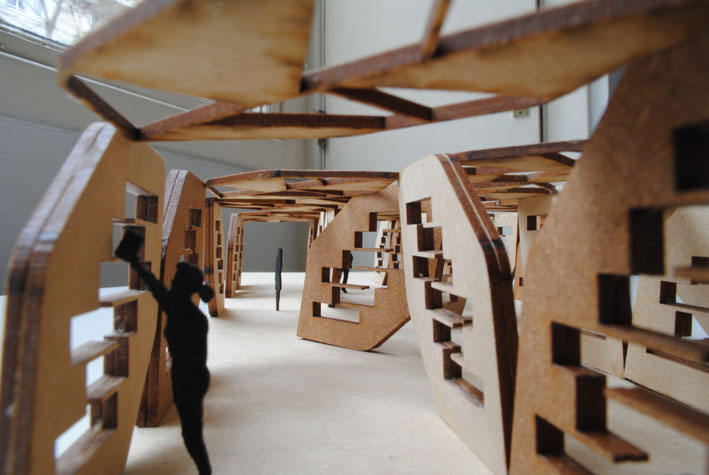 Los anaqueles se alinean formando calles internas intercomunicadas por accidentes y giros del ritmo del módulo. Se busca recuperar la confusión y la excitación de caminar por calle Florida o Av. Corrientes, con librerías sin vidrio en el frente, abiertas, disponibles, donde los libros saltan a los ojos del paseante, donde los libros salen a la calle.